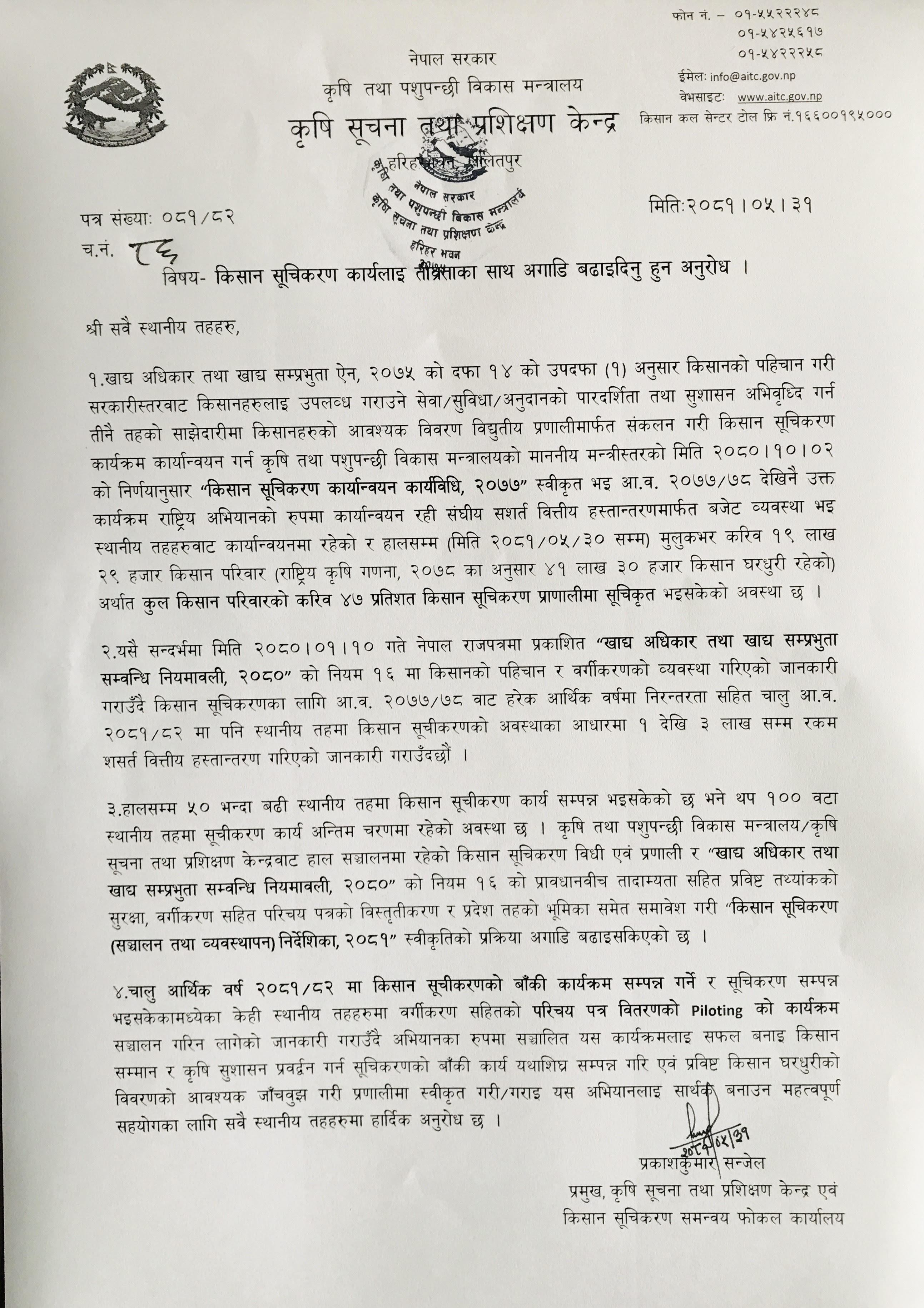किसान सूचिकरण कार्यलाई तीव्रताका साथ अगाडि बढाइदिने अनुरोध विषयमा