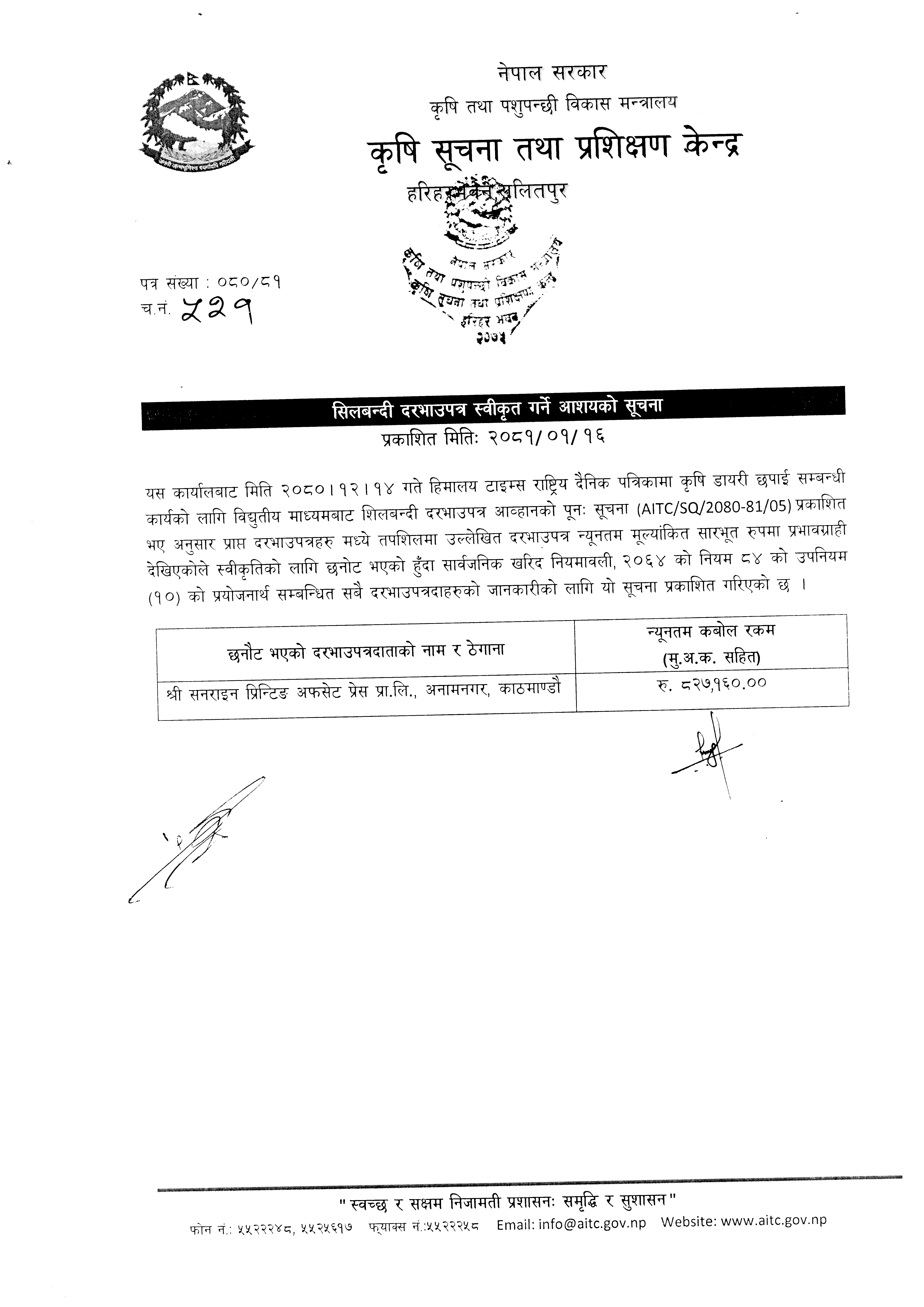 सिलबन्दी दरभाउपत्र स्वीकृत गर्ने आशयको सूचना