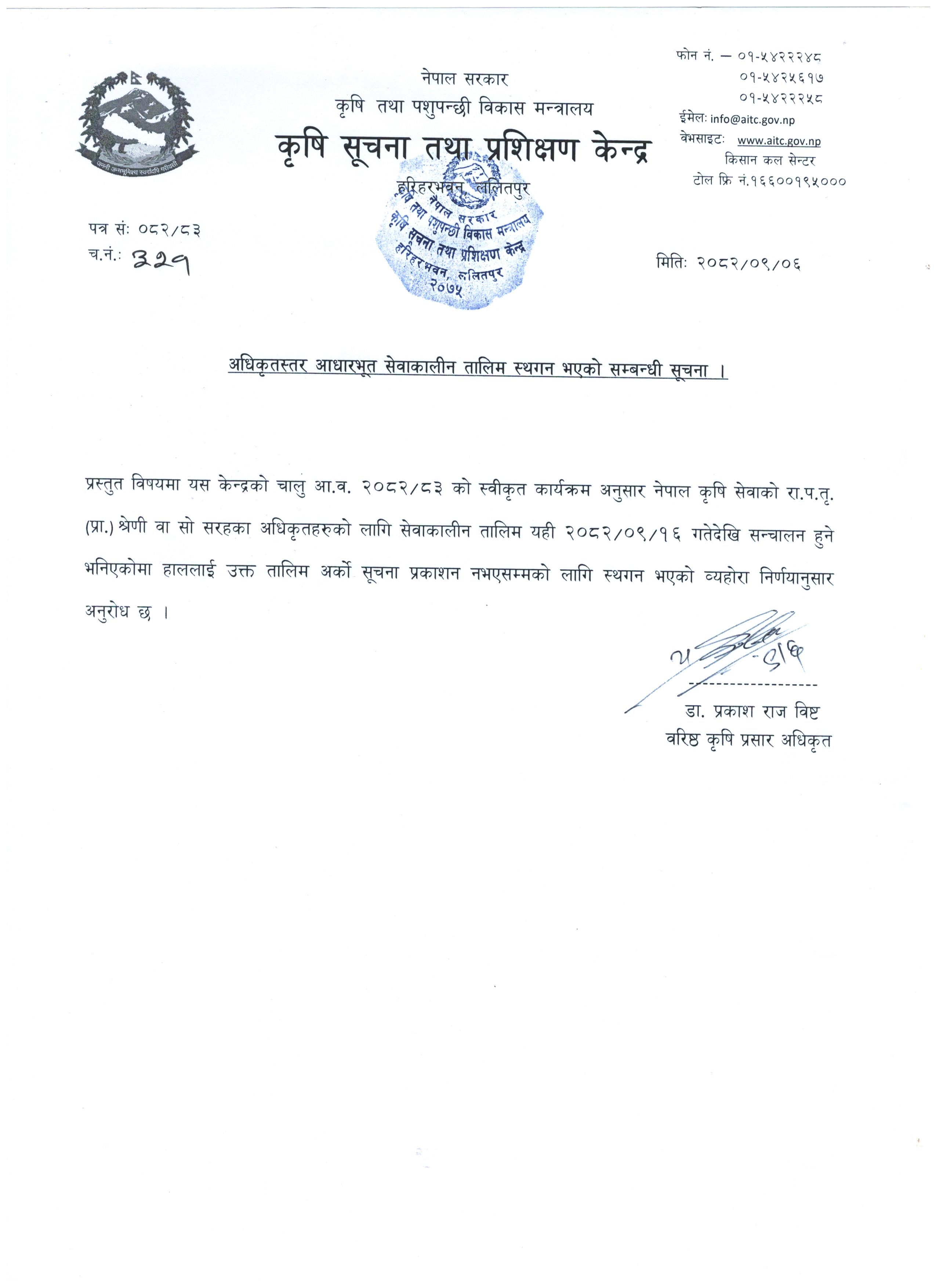 अधिकृतस्तर आधारभूत सेवाकालिन तालिम स्थगन भएको सूचना