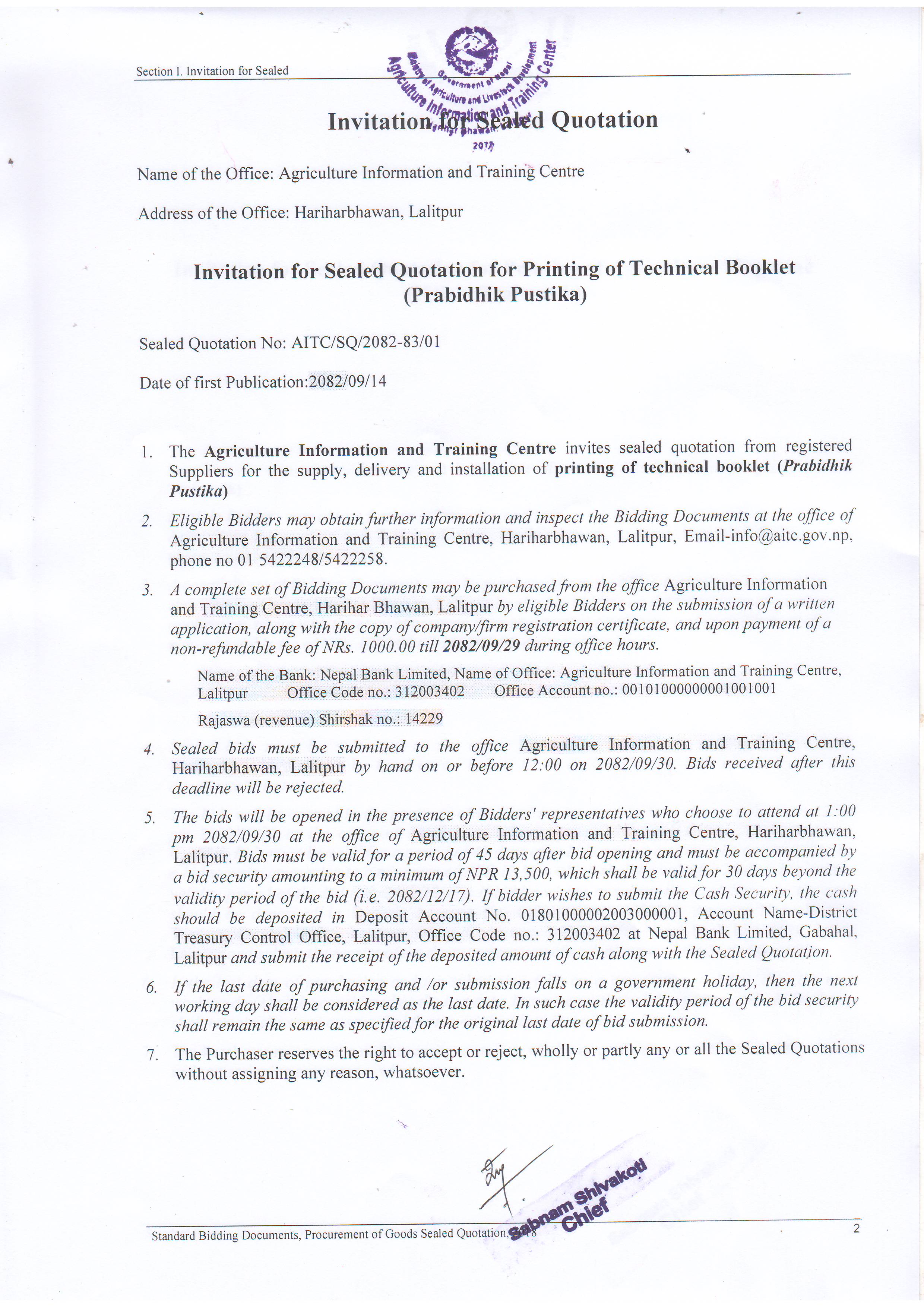 Invitation for Sealed Quotation for Printing of Technical Booklet